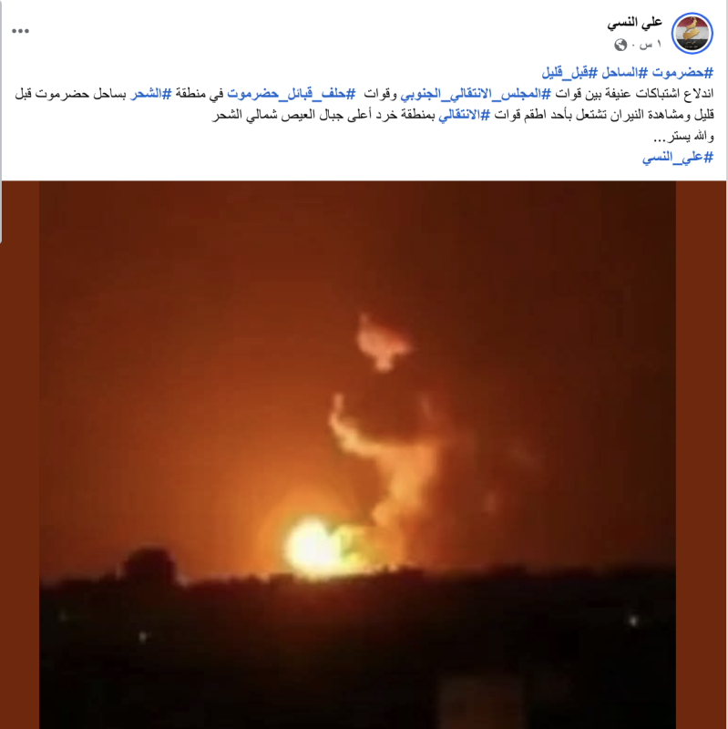 نشرت حسابات وصفحات على منصات التواصل الاجتماعي فيس بوك وإكس صورة زعمت أنها لإندلاع اشتباكات بين قوات المجلس الانتقالي الجنوبي وقوات حلف قبائل حضرموت في منطقة الشحر بساحل حضرموت