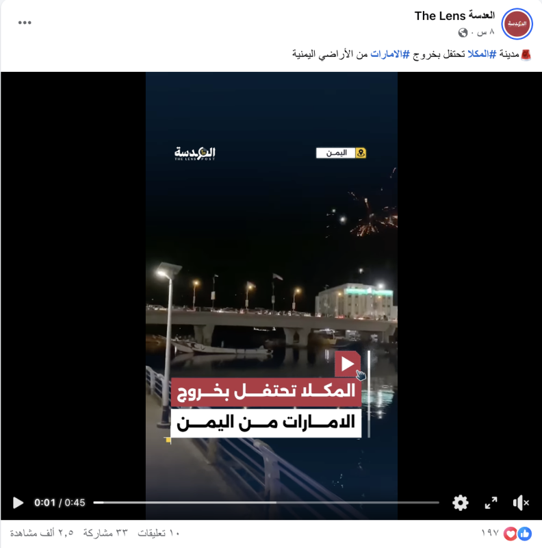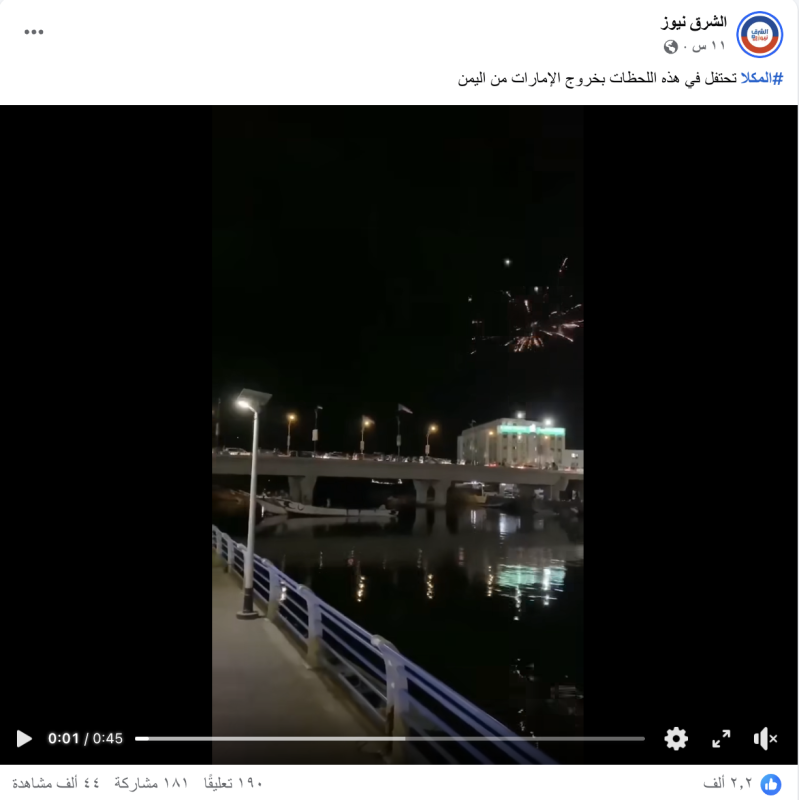 تداولت حسابات على منصة التواصل الاجتماعي فيسبوك فيديو ادعت أنه لاحتفالات في المكلا بمناسبة إعلان الإمارات انسحابها من اليمن.