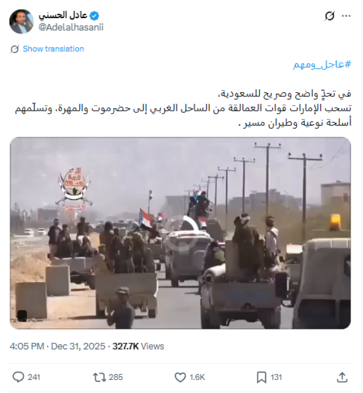 نشرت حسابات على منصة «إكس»، مقطع فيديو زعمت أنه يُظهر تعزيزات عسكرية لقوات ألوية العمالقة في طريقها إلى محافظتي حضرموت والمهرة شرقي اليمن.