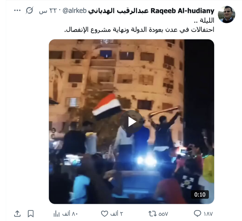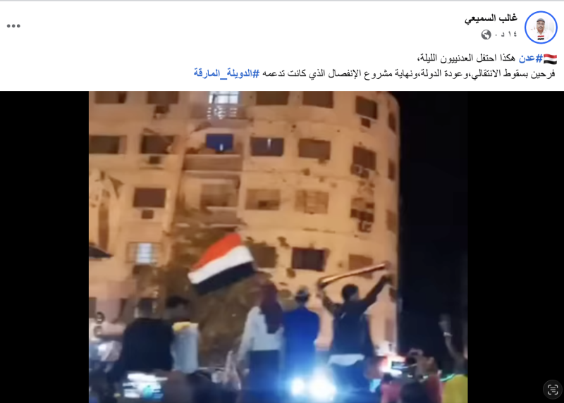 نشرت حسابات وصفحات على منصات التواصل الاجتماعي مقطع فيديو يظهر احتفالات في مدينة عدن مدعين أنها لاحتفالات حديثة لسكان عدن فرحة بسقوط الانتقالي وعودة الدولة