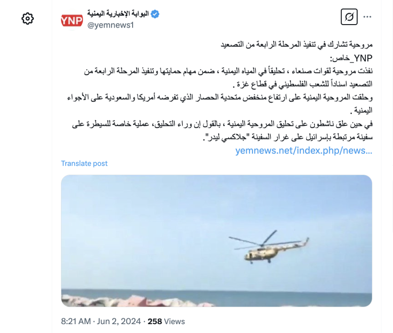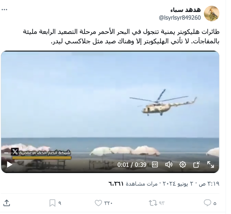 نشرت حسابات وصفحات على منصة التواصل إكس مقطعا لتحليق مروحية على سواحل الحديدة مدعية أنه يأتي في إطار مرحلة التصعيد الرابعة التي أعلنت عنها جماعة الحوثيين في مايو الماضي